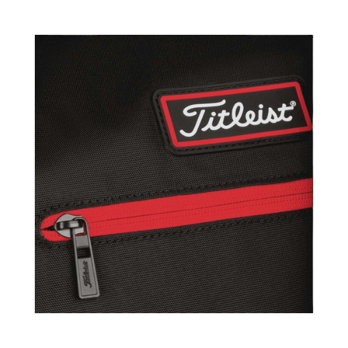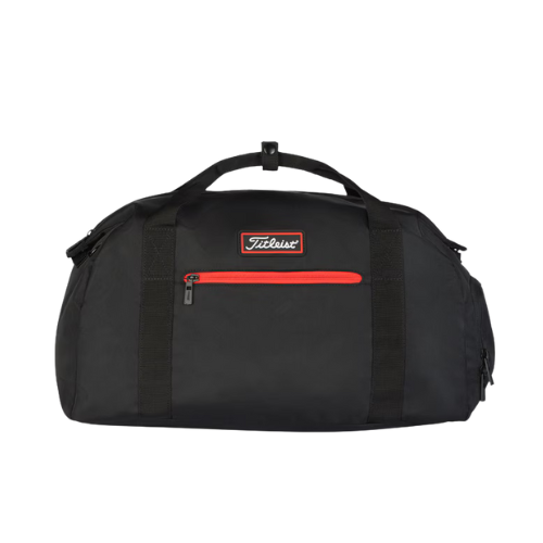 A compact, stylish hold-all designed for golfers on the move. It offers generous storage space with multiple interior pockets for organization, plus an exterior zippered valuables pocket. The bag features wrapped carry handles with a snap closure, a padded adjustable shoulder strap, and premium hardware. Its dimensions are approximately 11″ × 19″ × 11″.